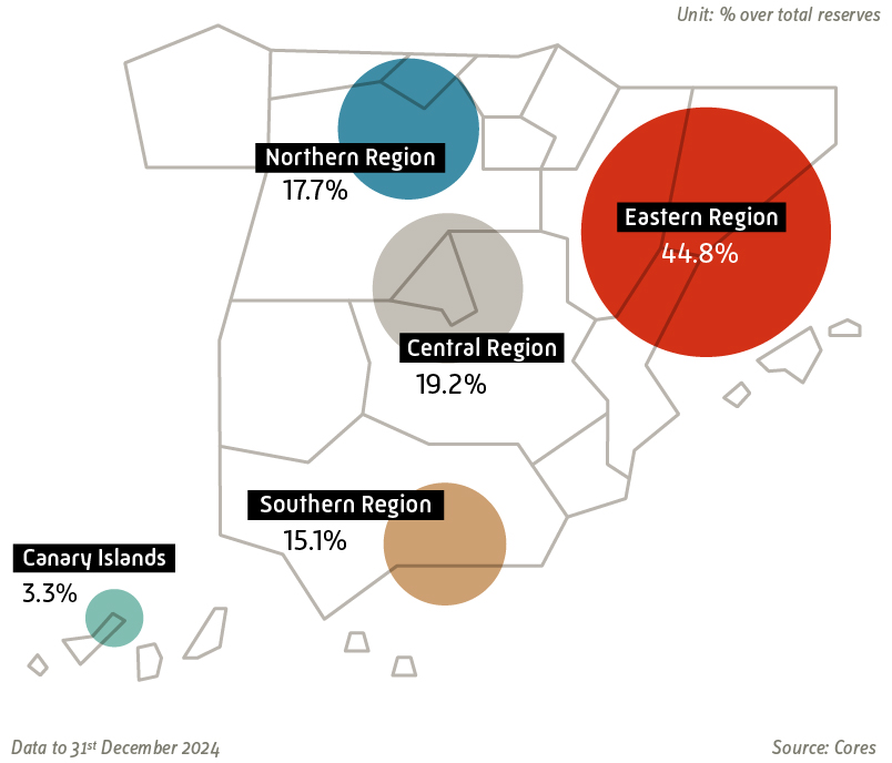 The strategic stocks are distributed throughout Spain in five different areas, based on the consumption needs of each of them. CORES does not hold any stocks outside Spain.