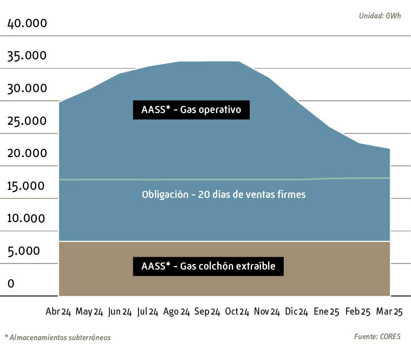 - 10 días de existencias mínimas operativas del sistema, a mantener en todo momento en almacenamiento subterráneo. El cálculo se realiza anualmente, una vez finalizado el año de suministro, y es de aplicación durante el periodo comprendido entre el día 1 de abril y el 31 de marzo del año siguiente.