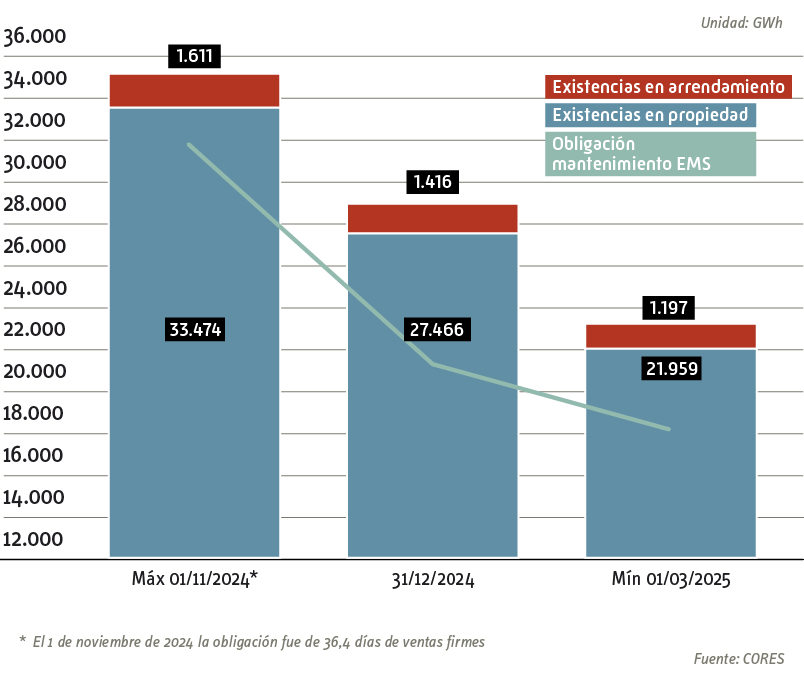 - Los días de existencias mínimas operativas del usuario que se calculen anualmente según el artículo 4 de la Orden TED/72/2023, de 26 de enero, en función de la trayectoria de llenado indicada en el artículo 6 de dicha Orden. En el caso de que esta obligación supere los 7,5 días, los sujetos obligados podrán cumplirla parcialmente mediante gas natural licuado (GNL) almacenado en plantas de regasificación nacionales, como máximo por el volumen que exceda los citados 7,5 días, incluyéndose GNL asignado al cumplimiento de las obligaciones del Plan de Actuación Invernal. El resto debe estar en almacenamiento subterráneo.